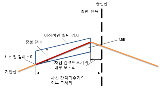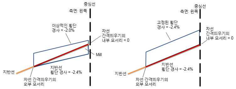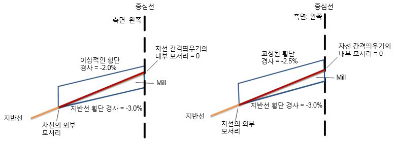 횡단 경사 및 표고 조정이 최소 레벨링 및/또는 최소 밀링 깊이를 충족합니다. 기준은 기존 지표면입니다.