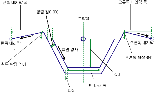 | 오른쪽 확장 높이 | 삽입점에서 수로 오른쪽의 확장입니다. | 숫자, 양수 |