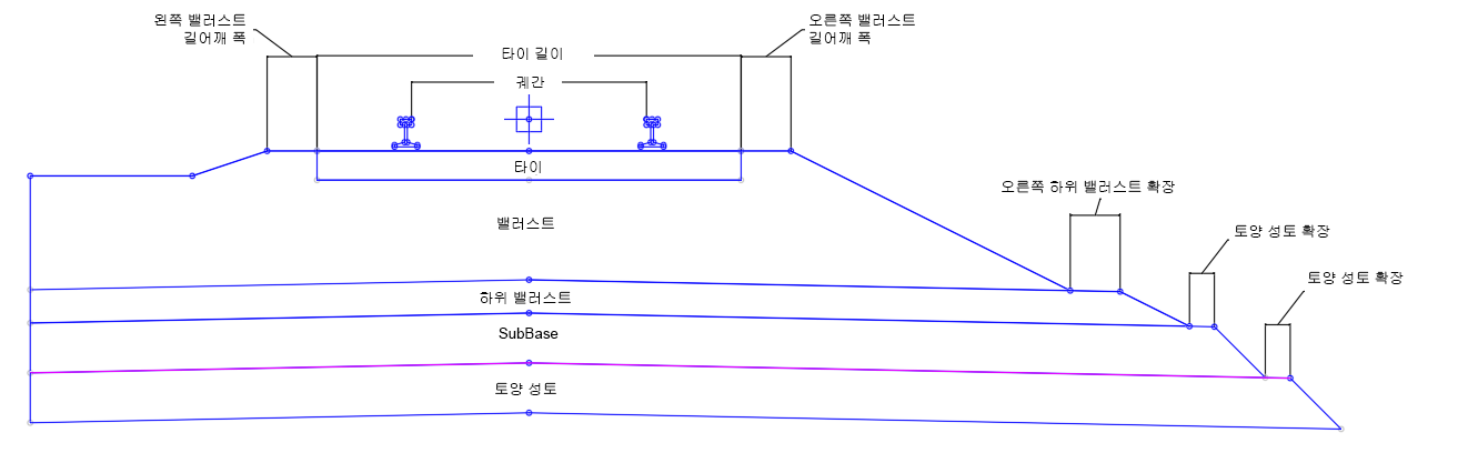 | 보조기층 확장 | 하위 밸러스트 재료의 돌출부에서 보조기층 재료의 측면 경사가 시작하는 지점까지 거리입니다. | 숫자, 음수 아님 |