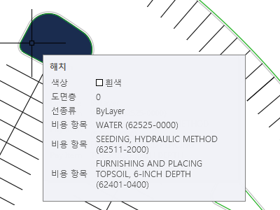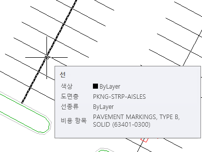 주차장 교통섬에 솔리드 해치 패턴이 표시됩니다. 이는 비용 항목이 영역에 적용되었음을 나타냅니다.