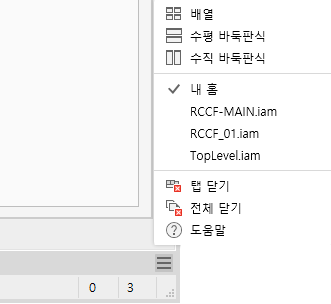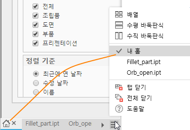 문서는 하나 이상의 모니터의 하나 이상의 창에 표시할 수 있습니다. Inventor 시작하면 기본 창이 "내 홈"이고 탭에 이 아이콘이 표시됩니다. 응용프로그램 옵션, 일반 탭에서 기본 화면표시를 끌 수 있습니다. 이 문서 탭 메뉴에는 창 배치 옵션 및 활성 문서가 표시됩니다.