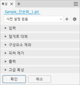 단순화 명령을 사용하면 조립품에서 부품을 작성할 수 있습니다. 단순화된 부품에서 제거할 구성요소 및 피쳐를 지정하거나 기본 제공 사전 설정 중 하나를 사용합니다.