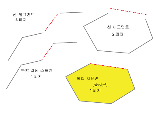 복합은 특정 선 세그먼트가 다른 여러 속성을 가질 수 있는 폴리곤 또는 행 문자열 객체에 사용됩니다. 따라서 복합은 선 세그먼트 그룹을 하나의 객체로 나타냅니다. 예를 들어, 여러 하위 선 세그먼트가 하나의 상위 폴리선으로 결합되거나 여러 하위 선 세그먼트가 하나의 상위 폴리곤으로 결합됩니다.