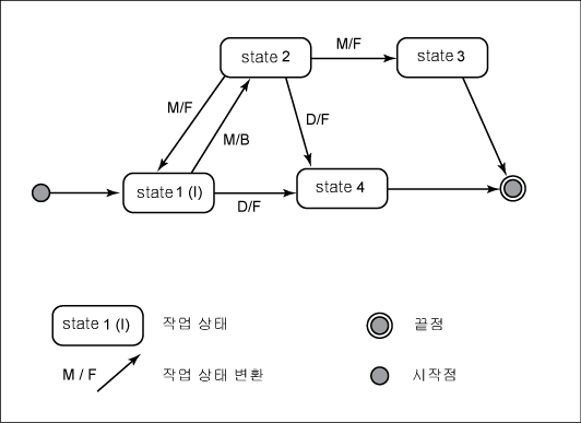 작업 상태 및 작업 상태 변환을 보여주는 그림입니다. 변환 방향은 앞으로 F 또는 거꾸로 B가 될 수 있으며, M은 피쳐를 병합합니다.