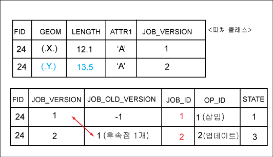 사용자가 특정 작업(JOB_ID) 내의 피쳐에 대해 작업을 수행할 경우(예: 피쳐 수정), 해당 작업이 TB_JOB_VERSION에 다음과 같이 등록됩니다.