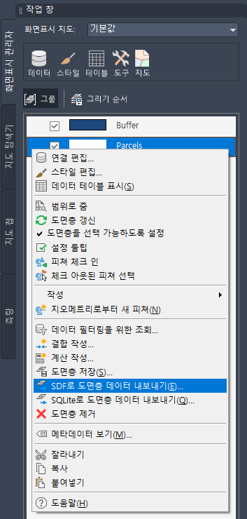 도면층 데이터를 내보낼 구획 도면층을 마우스 오른쪽 버튼으로 클릭합니다.