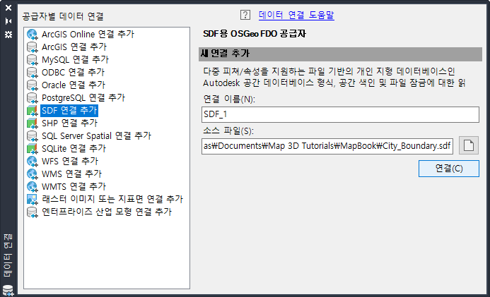 - 데이터 연결 윈도우의 공급자별 데이터 연결(왼쪽) 아래에서 SDF 연결 추가를 선택합니다.