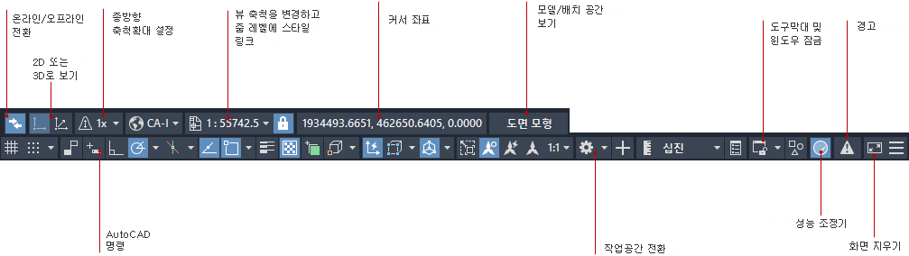 현재 명령에 대한 설명이 일부 상태막대 항목을 대치하며 일부 항목은 게시 또는 플로팅과 같은 작업이 진행 중일 때만 나타납니다.