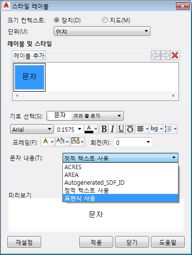 - 스타일 레이블 대화상자의 문자 내용에서 표현식 사용을 선택합니다.