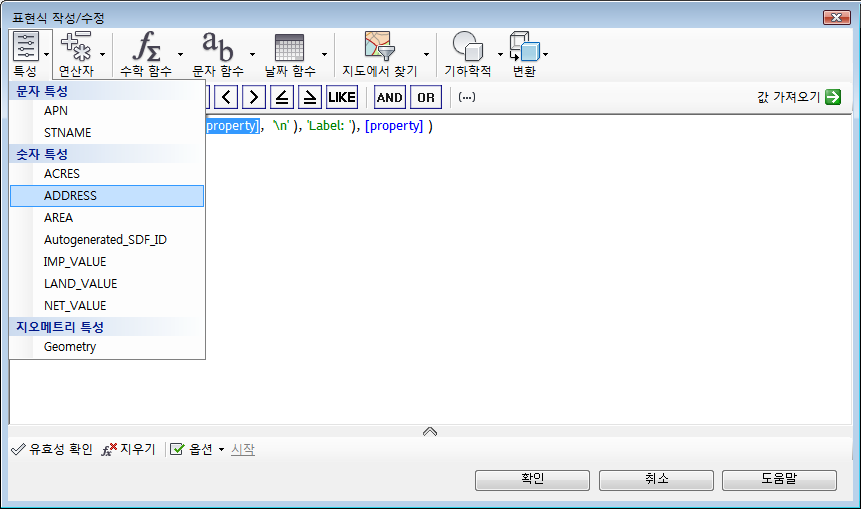 - 첫 번째 특성 항목을 대치하려면 해당 항목을 선택하고 표현식 작성/수정 윈도우의 맨 위에서 특성을 클릭합니다. 숫자 특성 ADDRESS를 선택합니다.