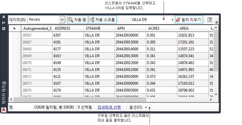 데이터 테이블의 필터 기준 리스트에서 STNAME 필드를 선택하고 VILLA DR을 필드에 입력합니다.