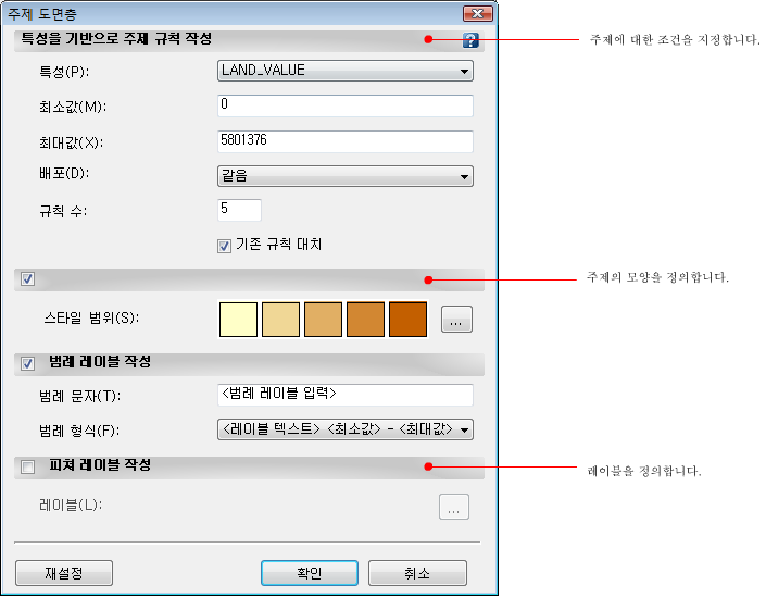 주제 정의를 구획 값과 연결합니다. 예를 들어 연한 색상은 값이 작은 구획을 나타내고 진한 색상은 값이 큰 구획을 나타냅니다. 구획 값은 지도의 구획 색상을 결정하는 데 사용되는 "조건"입니다.