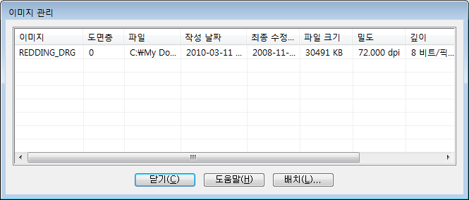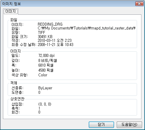 삽입한 이미지의 파일 이름, 크기, 밀도, 깊이 및 유형을 볼 수 있습니다. 이미지의 작성 날짜와 수정 날짜 및 이미지가 있는 도면층도 볼 수 있습니다.