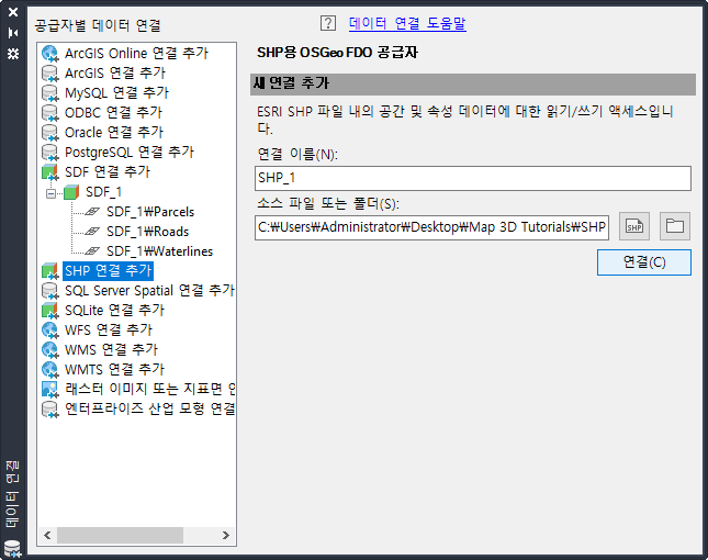 SHP 파일을 포함할 비어 있는 새 폴더를 작성합니다. 데이터를 SHP 형식으로 변환하고 복사하려면 이 폴더에 연결해야 합니다. 데이터 연결을 사용하면 데이터 저장소에서 아무것도 지도에 추가하지 않은 경우에도 데이터 저장소에 연결할 수 있습니다.