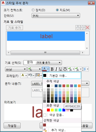 이 연습에서는 문자 도면층의 스타일을 지정하여 문자를 굵게 만들고 색상을 변경합니다. 스타일 문자 도면층 대화상자에는 여러 가지 설정이 있습니다. 대부분의 설정은 피쳐 데이터 소스와 연결되어 있으므로 변경하면 안 됩니다.