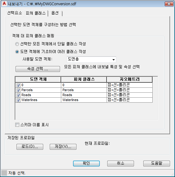 대화상자의 테이블이 업데이트되어 사용될 도면층 이름과 피쳐 클래스 이름이 표시됩니다.