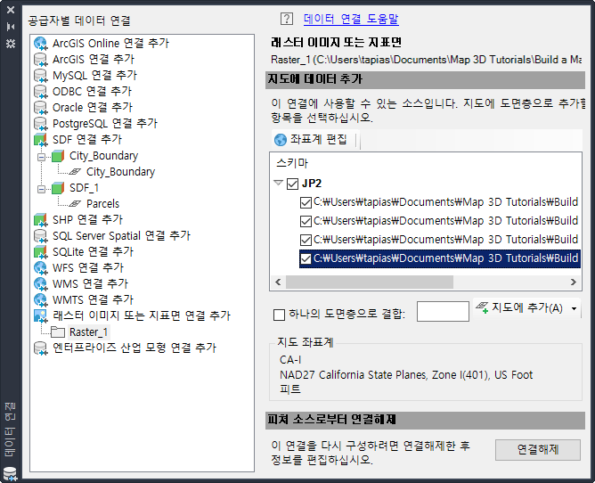- 공급자별 데이터 연결 아래에서 래스터 이미지 또는 지표면 연결 추가를 선택합니다.