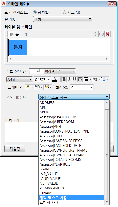 계산된 특성을 주제의 기준으로 하여 구획 도면층의 주제를 지정했습니다. 표현식에 의해 내용이 결정되는 레이블을 추가했습니다.