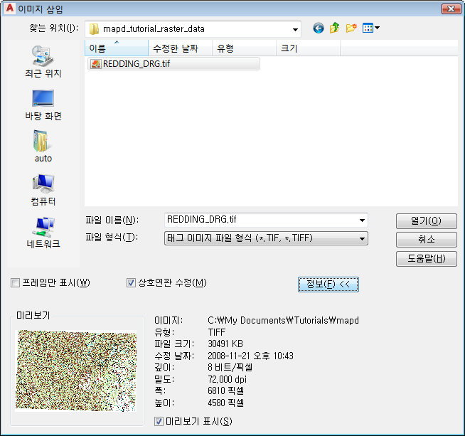상호연관 소스는 World File입니다. 실제 파일은 REDDING_DRG.tfw라고 합니다. 이 파일은 튜토리얼 샘플 파일을 복사한 위치에 저장됩니다.