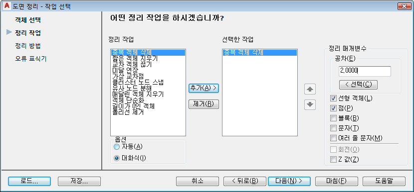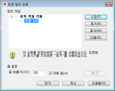 도면 정리 기능은 도면에서 오류를 찾고 도면 정리 오류 대화상자를 표시합니다. 대화상자에서는 오류를 유형별로 그룹화합니다. 중복 객체 삭제가 강조됩니다.