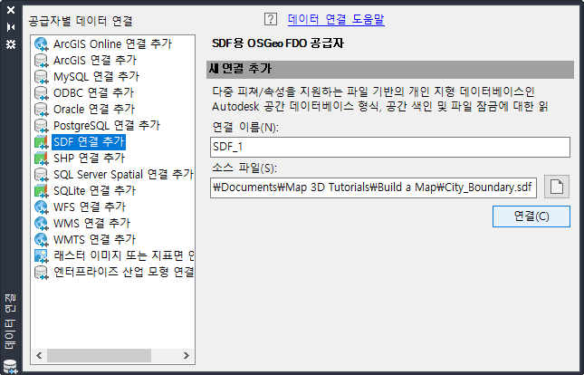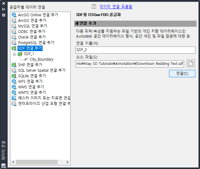 SDF 공급자를 선택하고 샘플 파일 CITY_BOUNDARY.SDF를 찾습니다.