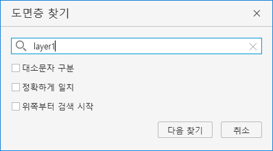 - 도면층 찾기 대화상자에서 도면층 이름에 검색할 키워드를 지정하고 다음 옵션 중에서 선택합니다.