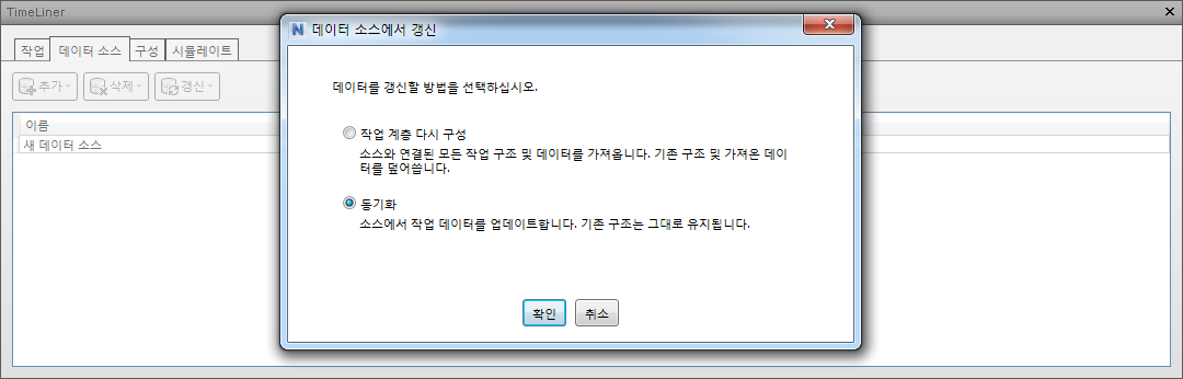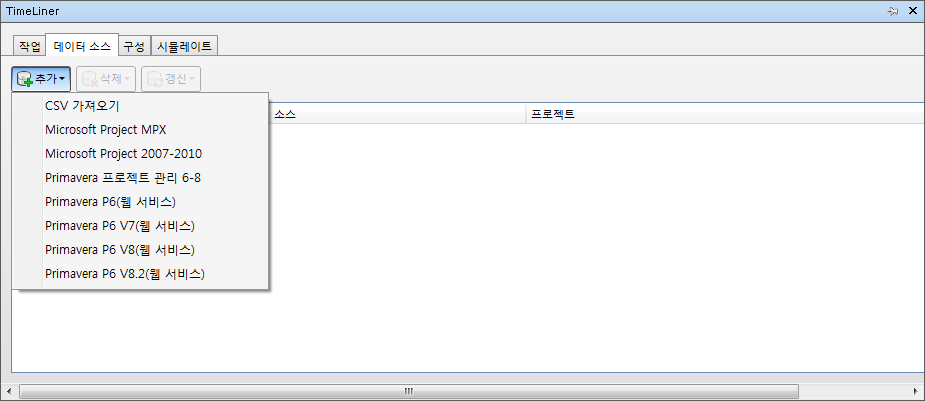 데이터 소스 탭을 사용하여 Microsoft Project™와 같은 외부 소스에서 작업을 가져올 수 있습니다. 외부 일정에서 필드를 선택하여 가져온 작업의 유형을 정의하거나 직접 작업 유형을 설정할 수 있습니다. TimeLiner에서 작업 매개변수를 바로 편집할 수 있습니다. TimeLiner에서 일람표를 외부적으로 업데이트하고 작업을 갱신하여 외부 소스의 작업과 조정할 수도 있습니다. 외부 프로젝트 파일에서 가져온 작업의 변경 사항은 다음에 해당 데이터 소스를 갱신할 때 덮어쓰여집니다.
