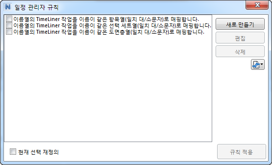 도면층, 항목 또는 선택 세트 이름을 기반으로 초기 작업 세트를 작성할 때 작업 탭에서 작업 자동 추가 기능을 사용했다면 해당 도면층, 항목 또는 선택 세트가 이미 연결되었을 것입니다.