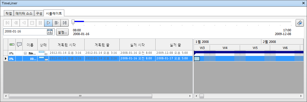 일정 시뮬레이션. 현재 강조된 활성 작업으로 일정의 임의 날짜에 모형을 시각화할 수 있습니다. 컨트롤을 사용하여 전체 일람표를 실행합니다. 구성 일람표에 TimeLiner 일람표에 애니메이션 추가를 수행하여 시뮬레이션 품질을 향상시킬 수 있습니다.