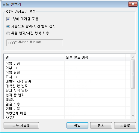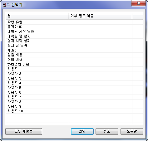 필드 선택기 대화상자에서는 외부 프로젝트 일정에서 데이터를 가져올 때 사용되는 다양한 옵션을 결정합니다.