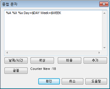 기본적으로 날짜 및 시간은 제어판 > 국가별 설정에 지정된 형식으로 표시됩니다. 텍스트 상자에 문자를 입력하면 사용할 형식을 정확하게 지정할 수 있습니다. “%” 또는 “$” 문자가 앞에 붙어 키워드로 동작하고 다양한 값으로 대체되는 단어를 제외하면 대부분의 문자는 입력한 대로 나타납니다. 날짜/시간, 비용 및 추가 버튼은 가능한 모든 키워드를 선택하고 삽입하는 데 사용할 수 있습니다. 색상 버튼은 중첩 문자의 색상을 정의하는 데 사용할 수 있습니다.