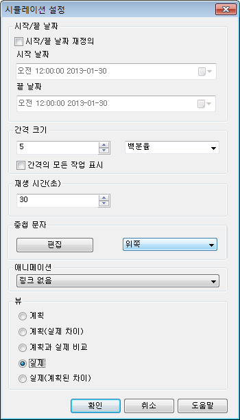 실제. 실제 일정만 시뮬레이션하려면 이 뷰를 선택합니다(실제 시작 및 실제 끝 날짜만 사용).