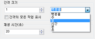 재생 컨트롤을 사용하여 시뮬레이션을 이동하는 데 사용하는 간격 크기를 정의할 수 있습니다. 간격 크기는 전체 시뮬레이션 기간의 백분율 또는 일, 주 등의 절대 숫자로 설정할 수 있습니다.