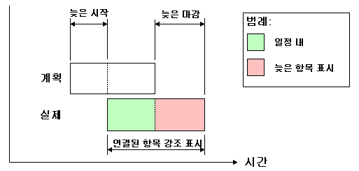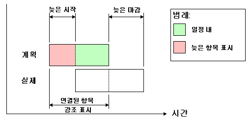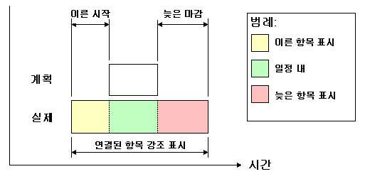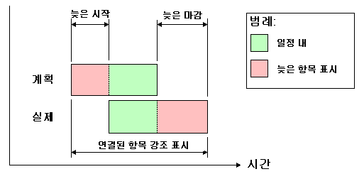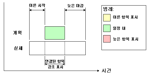 계획과 실제 비교. 계획 일정에 대한 실제 일정을 시뮬레이션하려면 이 뷰를 선택합니다. 이 뷰는 전체 계획 및 실제 날짜 범위(최초 실제 및 계획된 시작 날짜와 최신 실제 및 계획된 끝 날짜 사이) 동안 작업에 연결된 항목을 강조합니다. 그래픽 표현에 대해서는 아래 다이어그램을 참고하십시오. 실제 날짜가 계획 날짜(일람표의 날짜) 이내에 있는 기간의 경우 작업에 연결된 항목은 작업 유형 시작 모양에 표시됩니다. 실제 날짜가 계획 날짜와 비교하여 빠르거나 늦는(차이가 있는) 기간의 경우 작업에 연결된 항목은 작업 유형, 초기 또는 후기 모양에 각각 표시됩니다.