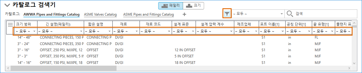 파이프 구성요소의 카탈로그를 찾아서 시방서에 추가할 구성요소(부품)를 선택합니다.
