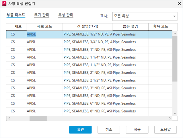 - 시방서 편집기의 시방서 시트 창에서 부품(예: 파이프, PE, ASME B36.10)을 클릭합니다.