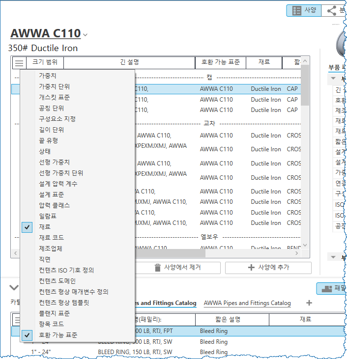 시방서 열에 표시할 특정 특성을 선택하고 열을 끌어 각 열의 위치를 수동으로 조정할 수 있습니다.