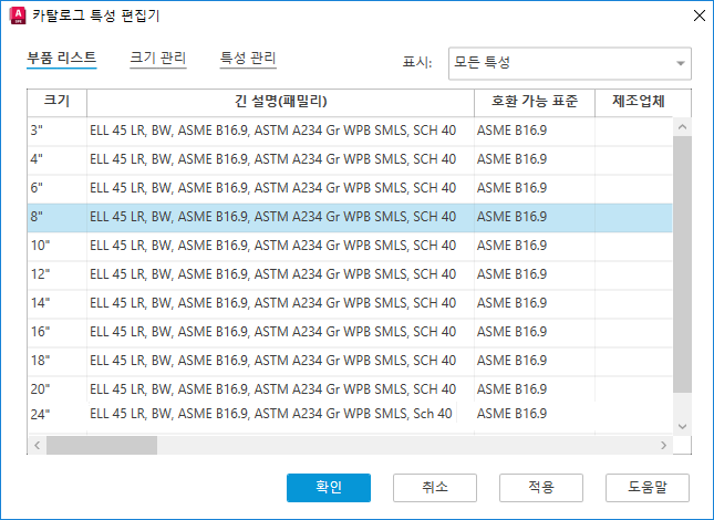 시방서 시트에 포함하기 위해 선택한 부품 패밀리 내에서 부품을 편집합니다.