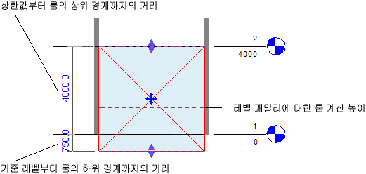 Revit에서 임시 치수를 표시하여 룸의 상한값 및 베이스 레벨로부터 상위 및 하위 경계까지의 거리를 나타냅니다. 원하는 경우 값을 적접 입력할 수 있습니다. 임시 치수 사용을 참고하십시오.