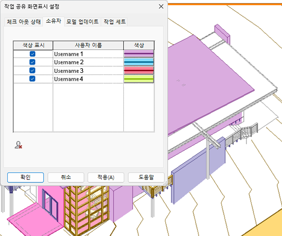 작업 공유 화면표시 설정을 클릭합니다. 해당하는 소유자의 지정된 색상이 모델에 표시됩니다.