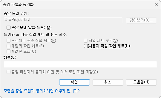| 결과: 로컬 파일이 중앙 파일과 동기화됩니다. | 해당 없음: 저장 후 중앙 모델로 만들기 옵션은 항상 선택되어 있습니다. |