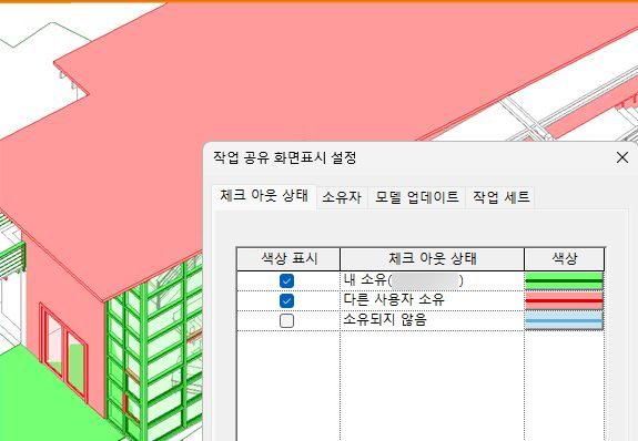 해당 소유자 체크 아웃 상태에 지정된 색상이 모델에 표시됩니다.