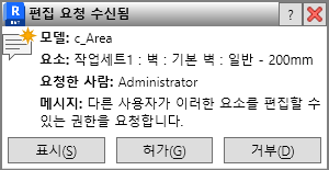 작업 공유 프로젝트를 사용하여 작업하는 경우 의사소통을 원활히 하기 위해 팀 구성원은 요소 차용 요청이 요청, 허가 및 거부될 때 자동 알림 메시지를 수신합니다.