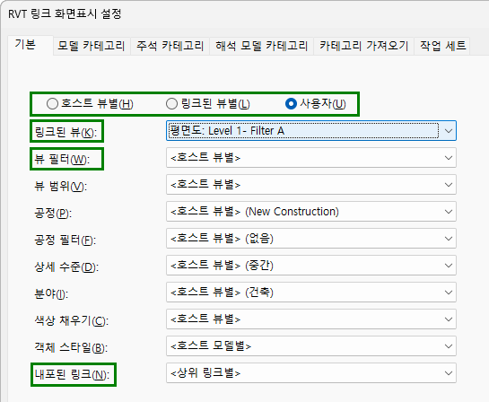 호스트 뷰에서 링크된 모델의 필터 사용을 제어하려면 RVT 링크 화면표시 설정 대화상자의 설정을 사용합니다.