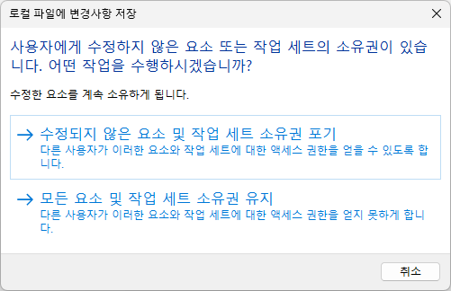 이 옵션을 사용하면 변경사항이 중앙 모델과 동기화되지 않고 로컬 모델에 저장되며 로컬 파일에 변경사항 저장 대화상자가 표시됩니다. 중앙 파일과 동기화하지 않았으므로 수정된 요소를 계속 소유하게 됩니다.