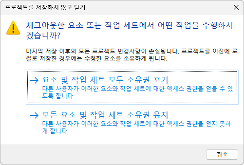 작업 공유 프로젝트의 변경 내용을 저장하지 않고 로컬 모델을 닫는 경우 변경사항이 저장되지 않음 대화상자가 표시됩니다.
