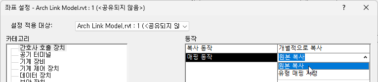 링크된 모델에서 MEP 모델로 설비를 복사할 때 또는 그 이전에 좌표 설정 지정 대화상자에서 각 설비 카테고리에 대해 매핑 동작을 지정합니다.