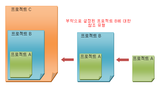 프로젝트 A(상위 모델 프로젝트 B 내에 있음)에 대한 참조 유형 설정을 부착으로 변경하면 프로젝트 B를 프로젝트 C로 가져올 경우 내포된 링크(프로젝트 A)가 표시됩니다.