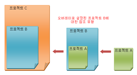 다음 이미지는 프로젝트 A가 프로젝트 B에 링크되어 있는 관계(프로젝트 B가 프로젝트 A의 상위 모델)를 보여 줍니다. 프로젝트 A의 참조 유형 설정은 상위 모델(프로젝트 B) 내에서 오버레이로 설정되어 있습니다. 프로젝트 B를 프로젝트 C로 가져오면 프로젝트 A가 표시되지 않습니다.