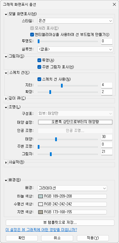 이 뷰는 그래픽 화면표시 옵션 대화상자에서 다음 설정을 사용합니다.